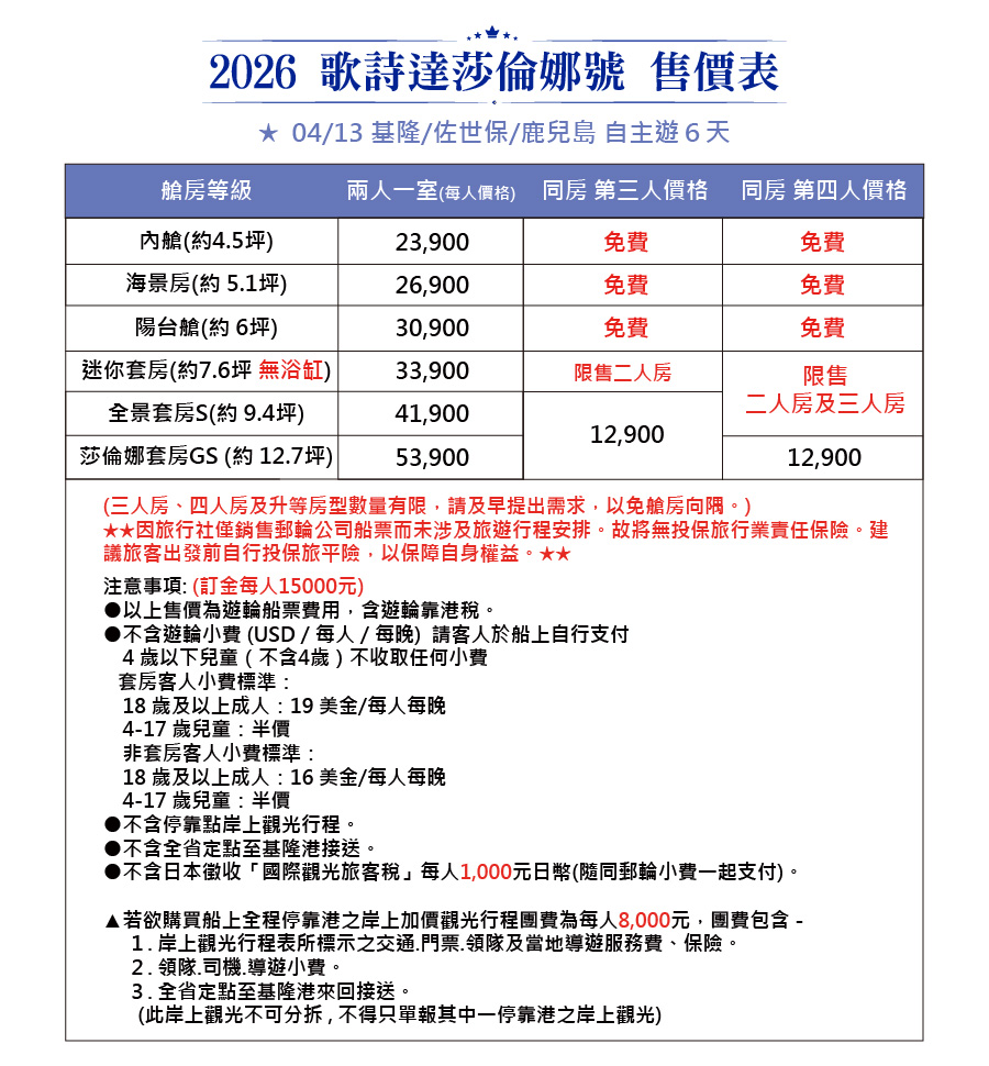 不含項目:不含岸上觀光費用,不含團險,不含郵輪小費,不含日本觀光旅客稅